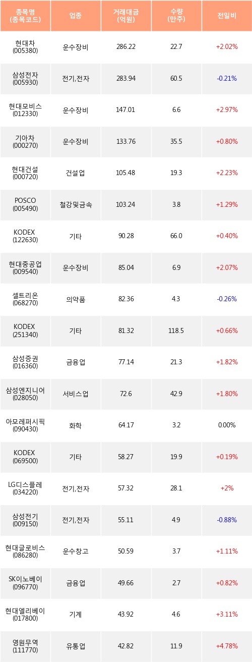 기관 투자자의 순매수 상위 20개 종목은 현대차, 삼성전자, 현대모비스, 기아차, 현대건설, POSCO, KODEX 레버리지, 현대중공업, 셀트리온, KODEX 코스닥150선물인버스등이다.