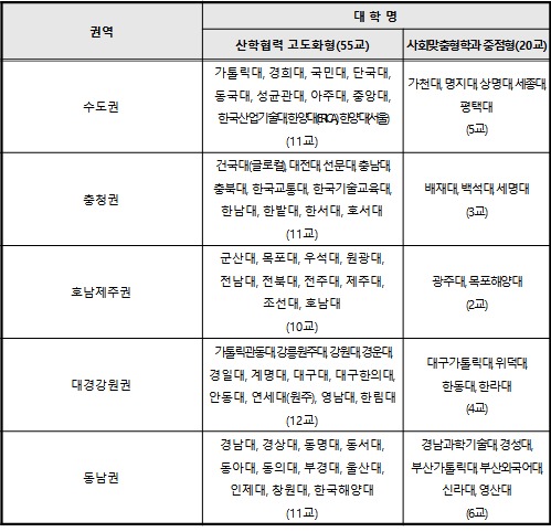 1차 단계평가와 이날 비교평가로 확정된 75개 대학 중 ‘산학협력 고도화형’으로 선정된 대학은 연 평균 약 37억원, ‘사회맞춤형학과 중점형’으로 선정된 대학은 연 평균 약 10억원을 지원받는다.