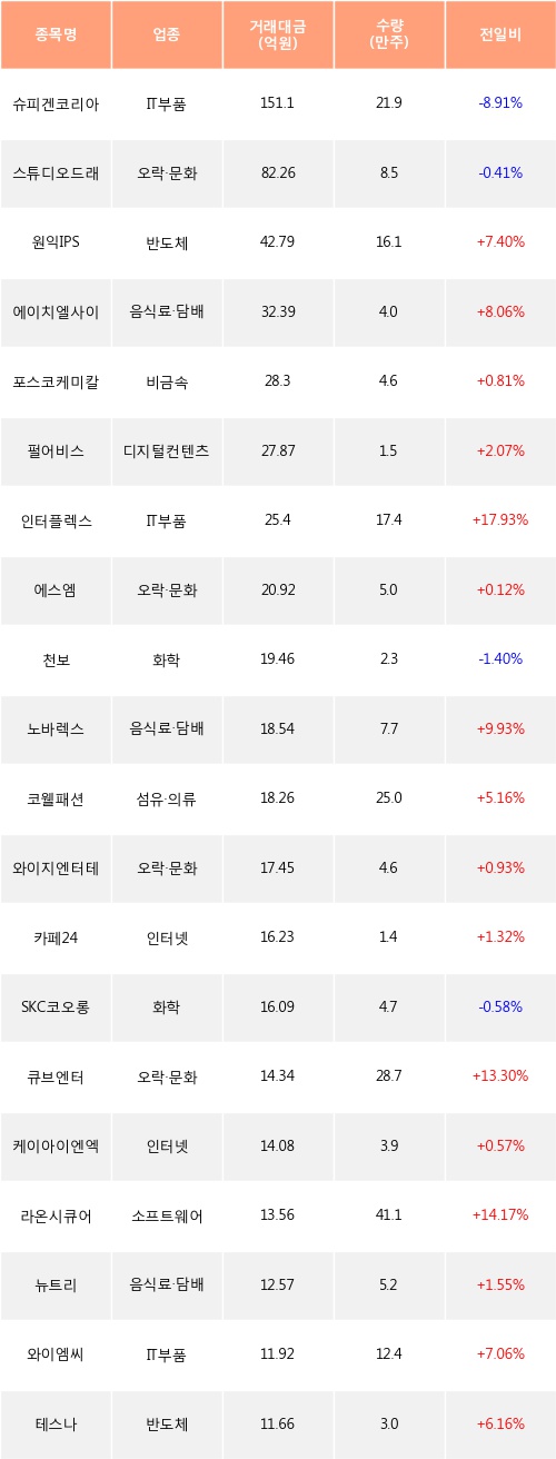 원익IPS, 에이치엘사이언스, 포스코케미칼 등은 전일 대비 주가가 상승했고, 슈피겐코리아, 스튜디오드래곤, 천보 등은 주가가 하락했다.