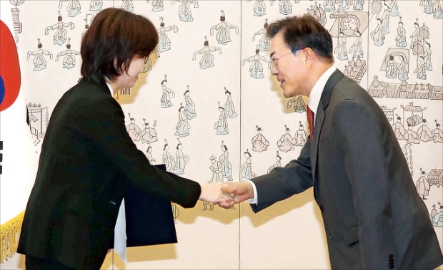 [ 허문찬 기자 ] 문재인 대통령이 25일 청와대 본관에서 이미선 헌법재판관(왼쪽)에게 임명장을 준 뒤 악수하고 있다. 문 대통령은 이날 문형배 재판관에게도 임명장을 수여한 후 “경력으로 보나, 판결을 보나, 법원 내 평가로 보나 두 분은 적임자”라고 말했다. 이 재판관에게는 “책임감과 사명감을 갖고 성공적으로 역할을 완수해 달라”고 당부했다.
