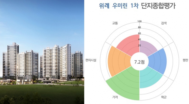 우미건설이 경기도 하남시 위례신도시 A3-4b블록에 짓는 ‘위례신도시 우미린 1차’는 7.2점을 받았다. 주변 아파트값과 비교해 3억원 이상 저렴한 분양가 덕분에 가격 면에서 높은 점수를 획득했다. 서울 접근성이 뛰어나다는 점도 영향을 미쳤다.