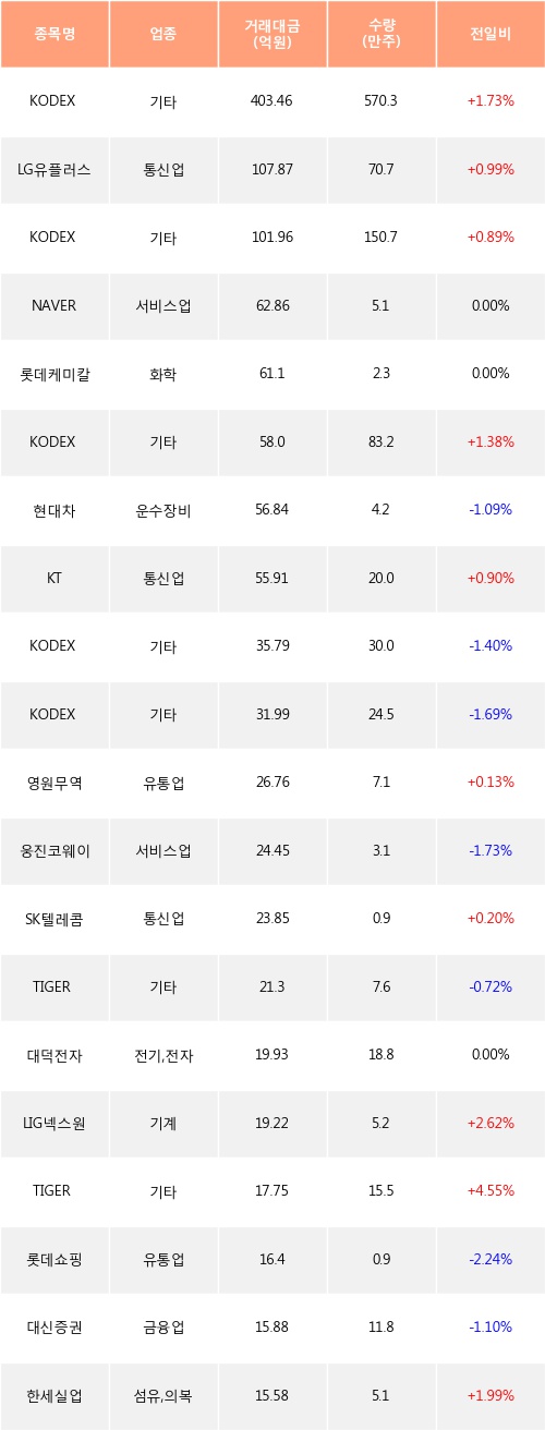 기관 투자자의 순매수 상위 20개 종목은 KODEX 200선물인버스2X, LG유플러스, KODEX 인버스, NAVER, 롯데케미칼, KODEX 코스닥150선물인버스, 현대차, KT, KODEX 코스닥 150, KODEX 레버리지등이다.