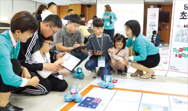 KT는 9일 ‘1사1병영’ 결연 부대인 잠수함사령부 군 가족 40여 명을 KT대구무선운용센터로 초청해 5세대(5G) 네트워크 시설 견학과 정보통신기술(ICT) 체험 행사를 열었다. 군 가족들은 통신 시설 견학, 챌린지 미니카 경진대회, 로봇 코딩 5G 세계여행 등 프로그램을 즐겼다. 잠수함사령부 군 가족이 로봇 코딩 체험을 하고 있다.