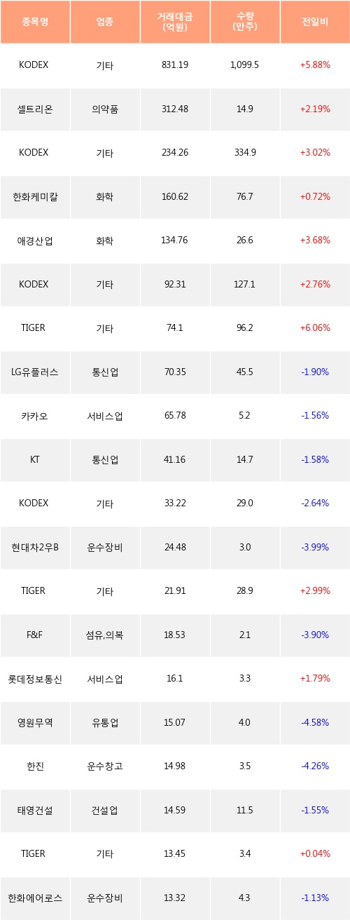 KODEX 200선물인버스2X, 셀트리온, KODEX 인버스 등은 전일 대비 주가가 상승했고, LG유플러스, 카카오, KT 등은 주가가 하락했다.