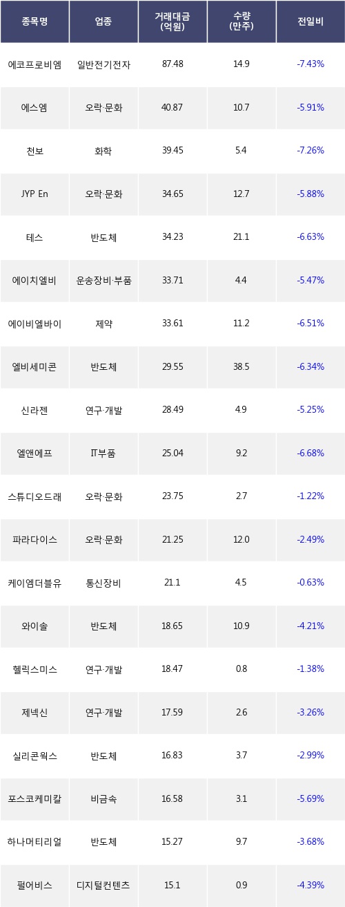 기관 투자자의 순매도 상위 20개 종목은 에코프로비엠, 에스엠, 천보, JYP Ent., 테스, 에이치엘비, 에이비엘바이오, 엘비세미콘, 신라젠, 엘앤에프등이다.