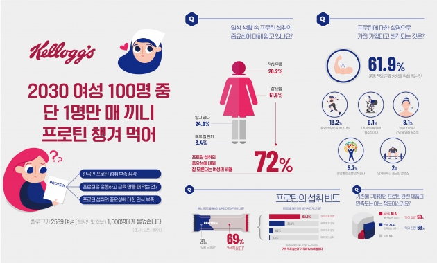 농심켈로그가 최근 25~39세 직장인과 주부 여성 1000명을 대상으로 모바일 리서치기업 오픈서베이를 통해 실시한 '프로틴(단백질) 섭취에 대한 설문조사' 결과 응답자 100명 중 단 1명만이 매 끼니 프로틴을 섭취한다고 답했다.