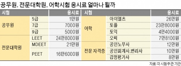 한국경제신문이 비교적 수험생들이 많이 몰리는 30개 공무원·자격증·전문시험 등의 응시료를 조사했다. 수험생이 납부한 응시료는 ‘수급자 부담’ 원칙에 따라 문제 출제, 고사장 섭외 등에 사용된다. 한 전문대학원 관계자는 “전문 대학원 응시료는 수익 사업이 아니기에 응시 인원이 많으면 낮춰질 가능성이 높다”고 말했다.