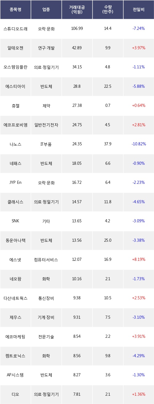기관 투자자의 순매도 상위 20개 종목은 스튜디오드래곤, 알테오젠, 오스템임플란트, 에스티아이, 휴젤, 에코프로비엠, 나노스, 네패스, JYP Ent., 클래시스등이다.