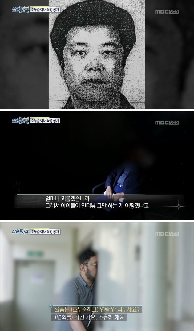 아동 성폭행으로 복역 중인 조두순의 출소가 565일 앞으로 다가온 가운데 MBC '실화탐사대' 측이 조두순의 사진과 조두순 아내 육성을 공개했다. 29일 오후 방송된 MBC '실화탐사대'에서는 제작진이 조두순의 아내 ㄱ씨와 만난 모습이 전파를 탔다.