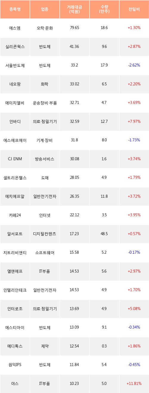 에스엠, 실리콘웍스, 네오팜 등은 전일 대비 주가가 상승했고, 서울반도체, 에스에프에이, 지트리비앤티 등은 주가가 하락했다.