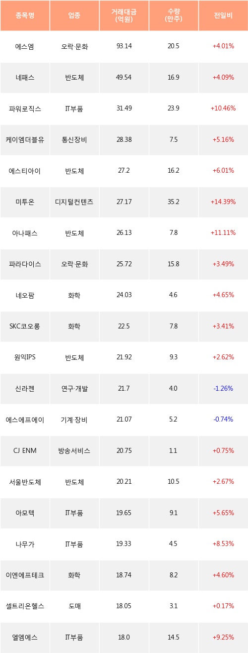 기관 투자자의 순매수 상위 20개 종목은 에스엠, 네패스, 파워로직스, 케이엠더블유, 에스티아이, 미투온, 아나패스, 파라다이스, 네오팜, SKC코오롱PI등이다.