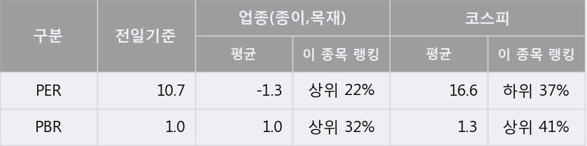 전일 종가를 기준으로 이 종목의 PER는 10.7배, PBR은 1.0배이다. PER는 종이,목재업종의 평균 PER -1.3배 대비 +12.0배 높은 수준으로 업종 내에서 상위 22%에 있고, PBR은 종이,목재업종의 평균 PBR 1.0배와 동일한 수준으로 업종 내에서 상위 32%에 위치한다.