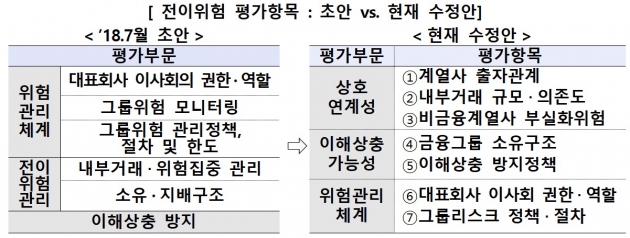 전이위험 세부평가 항목은 대표회사 이사회의 권한·역할이나 그룹 차원의 위험관리체계 외에도 계열사 출자관계, 내부거래 위험·의존도, 비금융계열사 부실화 위험 등이다.