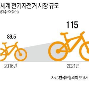 한국IR협의회는 세계 전기자전거 시장이 2016년 10조5300억원에서 2021년 13조6100억원으로 연평균 5.1% 성장할 것으로 추산했다. 2017년 자동차 제조사 포드에 이어 지난해 우버도 공유자전거 시장에 뛰어들었다.
