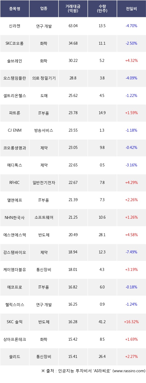 외국인 투자자의 순매도 상위 20개 종목은 신라젠, SKC코오롱PI, 솔브레인, 오스템임플란트, 셀트리온헬스케어, 파트론, CJ ENM, 코오롱생명과학, 메디톡스, RFHIC등이다.