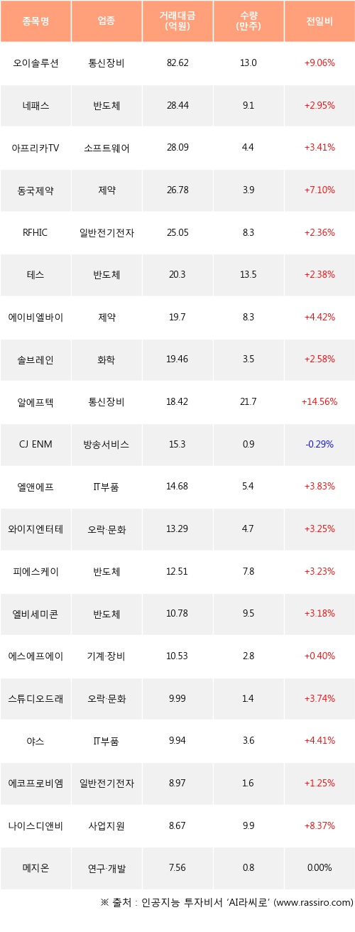 오이솔루션, 네패스, 아프리카TV 등은 전일 대비 주가가 상승했고, CJ ENM 등은 주가가 하락했다.