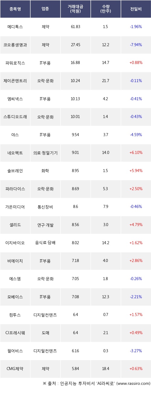 기관 투자자의 순매도 상위 20개 종목은 메디톡스, 코오롱생명과학, 파워로직스, 제이콘텐트리, 엠씨넥스, 스튜디오드래곤, 야스, 네오펙트, 솔브레인, 파라다이스등이다.