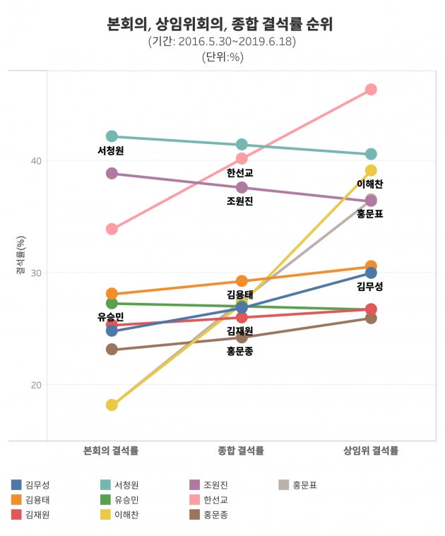 단순히 성실함의 측면에서 보면 본회의 출석률이 낮으면 상임위원회 회의 출석률도 낮을 것이라고 예상할 수 있습니다. 하지만 본회의 출석률은 낮은데 상임위원회 출석률이 높은 의원이 있고 그 반대의 경우도 있습니다.