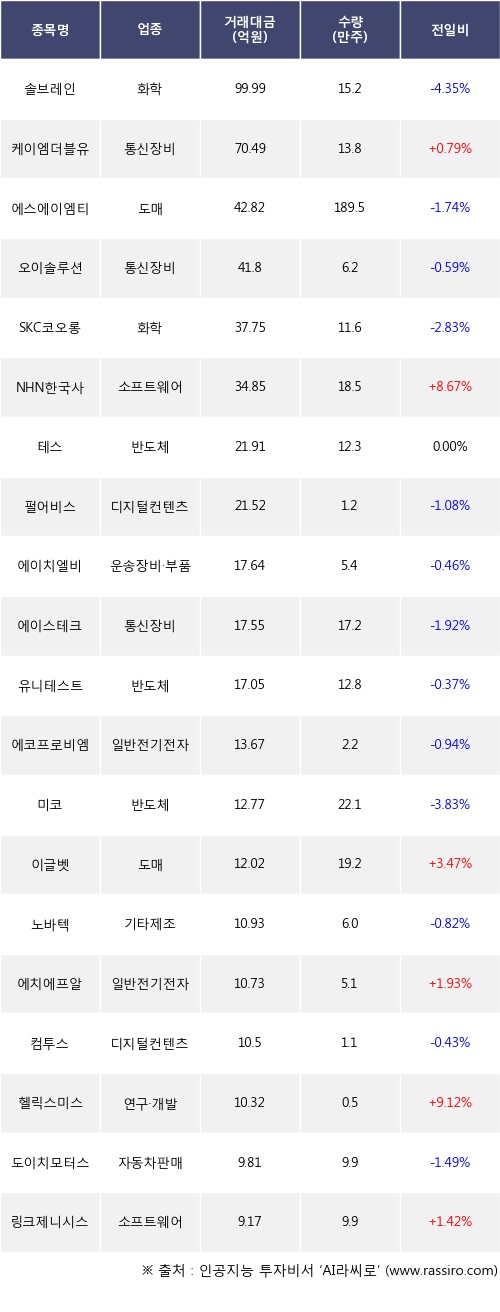 케이엠더블유, NHN한국사이버결제, 이글벳 등은 전일 대비 주가가 상승했고, 솔브레인, 에스에이엠티, 오이솔루션 등은 주가가 하락했다.