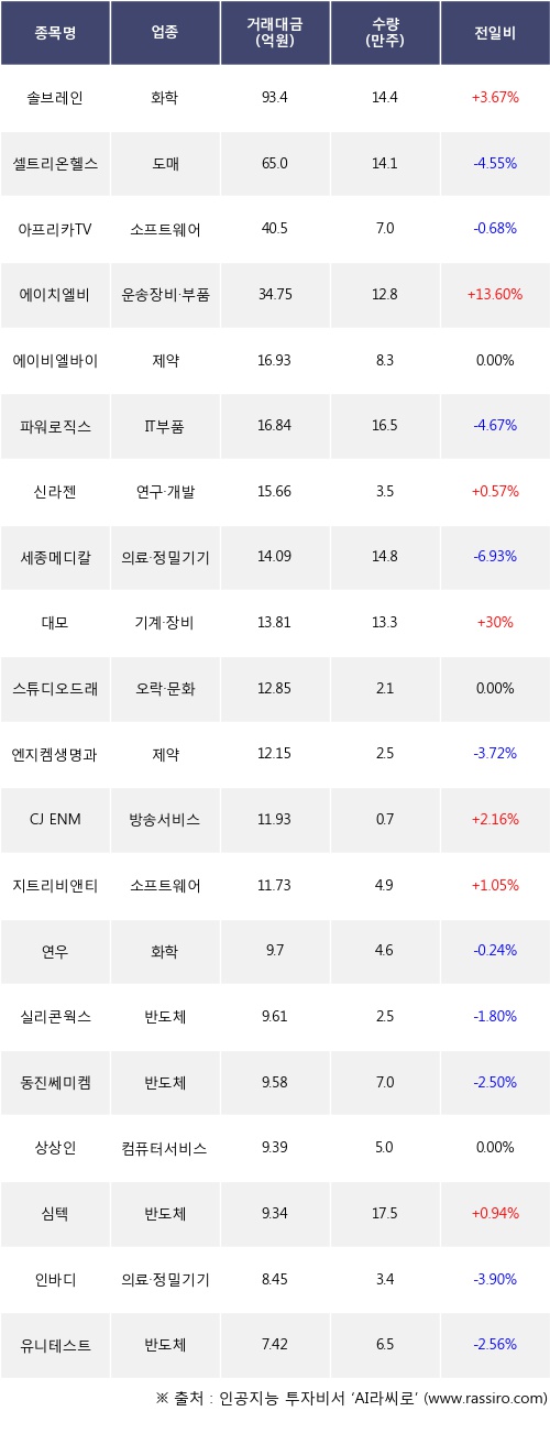 기관 투자자의 순매도 상위 20개 종목은 솔브레인, 셀트리온헬스케어, 아프리카TV, 에이치엘비, 에이비엘바이오, 파워로직스, 신라젠, 세종메디칼, 대모, 스튜디오드래곤등이다.