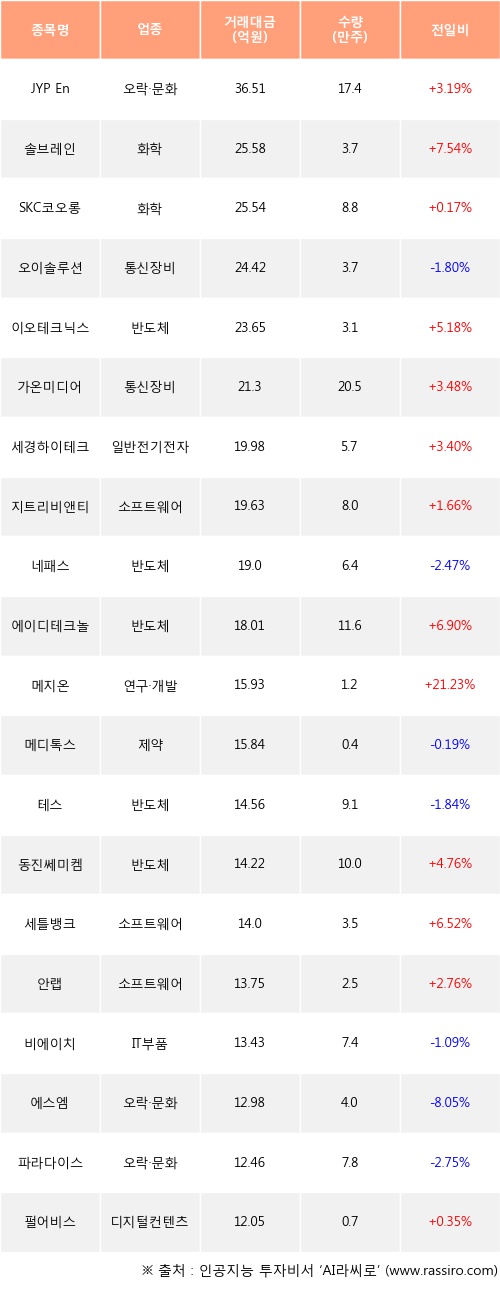 기관 투자자의 순매수 상위 20개 종목은 JYP Ent., 솔브레인, SKC코오롱PI, 오이솔루션, 이오테크닉스, 가온미디어, 세경하이테크, 지트리비앤티, 네패스, 에이디테크놀로지등이다.