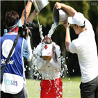 파에 그치며 우승이 확정되자 동료 선수들의 물세례를 받고 기뻐했다. 김태훈은 "스윙을 고치고 타이밍을 찾으면서 OB가 눈에 띄게 줄고 비거리도 오히려 더 늘었다"면서 "올해는 우승할 수 있을 것이라는 자신이 있었지만 이번 대회는 아니라고 생각했다"고 털어놨다. "조금 늦은 감은 있지만 하반기 한두 번 더 우승하고...