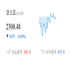 대비 0.97p(-0.04%) 하락한 2300.48p를 기록하고 있다. [그림 1] 현재 시각 코스피, 상승 및 하락 종목 수 현재 코스피는 전체 상장 종목 중 338개 종목이 상승세를 보이고 있으며, 475개 종목은 하락중이다. 83개 종목은 보합세를 나타내고 있다. 규모별로는 중형주(0.02%)만 홀로 상승세를 나타냈다. 대형주(-0.04%)와...