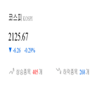 대비 6.26p(-0.29%) 하락한 2125.67p에 거래를 시작했다. [그림 1] 현재 시각 코스피, 상승 및 하락 종목 수 현재 코스피는 전체 상장 종목 중 405개 종목이 상승세를 보이고 있으며, 268개 종목은 하락중이다. 153개 종목은 보합세를 나타내고 있다. 규모별로는 소형주(0.23%)만 홀로 상승세를 나타냈다. 대형주(-0.27%)와...