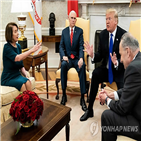 21일 미 의회의 예산안 처리 시한을 열흘 앞둔 가운데 양측이 팽팽히 맞서면서 연방정부 업무 일부가 정지되는 셧다운 가능성도 배제할 수 없게 됐다. 트럼프 대통령과 낸시 펠로시 민주당 하원 원내대표(맨 왼쪽)가 백악관 집무실에서 취재진을 앞에 두고 설전을 벌이고 있다. 이 장면을 마이크 펜스 부통령(왼쪽 두...