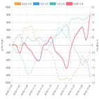 -497억원, -697억원 순매도 중이다. [그림 1] 최근 한달간 투자자별 매매동향 및 코스피 수익률 최근 한달간 투자자별 매매동향을 살펴보면 기관의 매수세가 두드러졌다. 최근 20거래일 기준으로 기관은 총 8,305억원을 순매수 했으며 외인과 개인은 각각 -1,437억원, -8,422억원 순매도 했다. 한편 이 기간동안 코스피는...